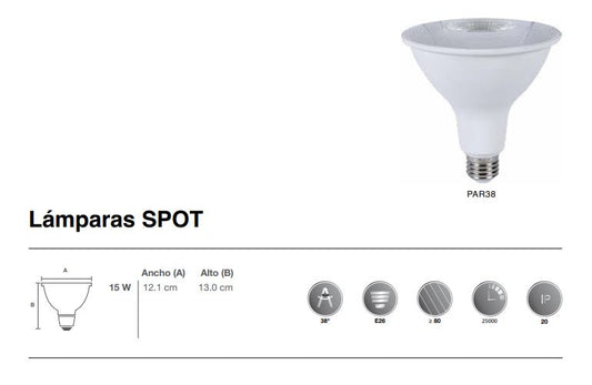 LAMPARA LED PAR38 15W 6500K 100-265V E27 CUELLO LARGO ICON PAR3815W65KMVLN LUZ FRIA
