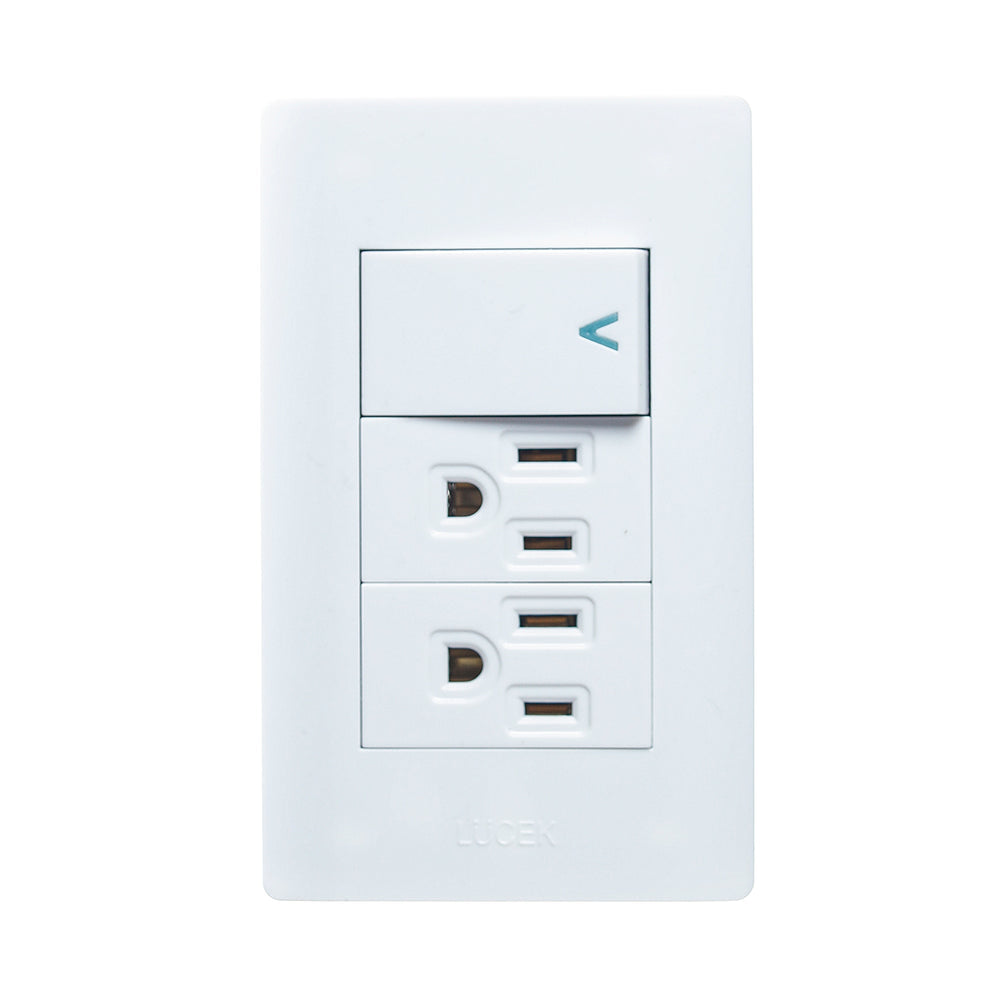 Placa de 3 módulos blanca con un apagador y dos contactos de 1 módulo. Fácil de instalar. Tecla mas ancha. 10a (apagador) 15a (contacto) 127v.